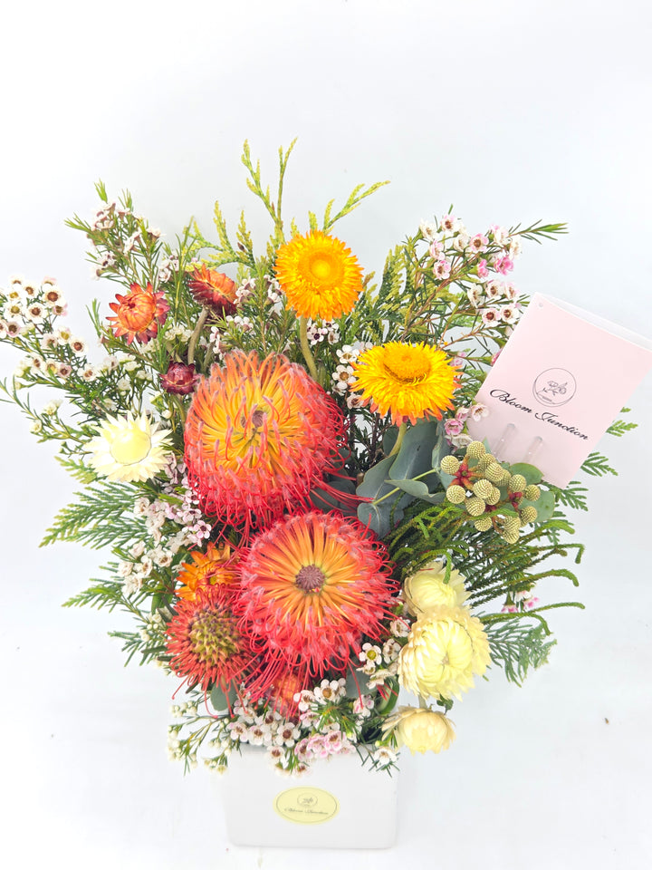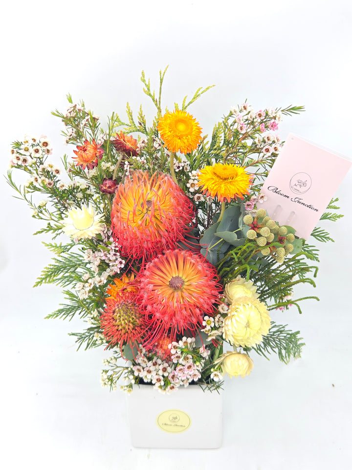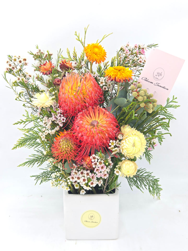 Enhance any space with our Native Postal Square Vase. An Australian native flower Bunch is a captivating and unique arrangement that showcases the extraordinary beauty of the continent's indigenous flora.This stylish vase, featuring a sleek square design, perfectly showcases your favorite native blooms. Made from high-quality materials, it adds a touch of modern elegance to any decor. Ideal for home or office, this vase is both functional and eye-catching. Order now to bring a piece of contemporary charm into your environment with our Native Postal Square Vase.