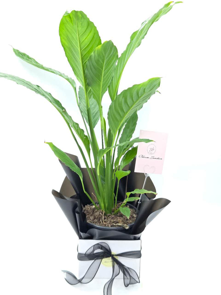 This Peace Lily is the perfect addition to any home or office space. Its lush and vibrant leaves not only add a touch of natural beauty, but also improve air quality by reducing toxins. With minimal care needed, it's a low-maintenance and beneficial plant for any indoor environment.