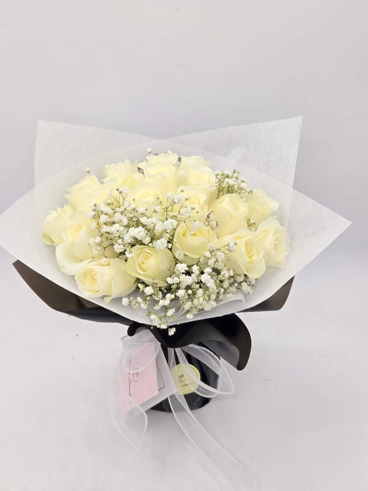 This gorgeous White Roses bouquet is the perfect gift for any occasion. The delicate white roses symbolize purity, love, and new beginnings. Their elegant appearance and sweet fragrance will brighten any room and bring joy to the recipient. Show your loved ones your care and thoughtfulness with this stunning bouquet. Bring a touch of beauty and love to someone's day with this uplifting bouquet. Made from delicate white roses, it's a thoughtful symbol of purity and new beginnings. The sweet fragrance and elegant appearance will surely brighten any room. Perfect for any occasion, it's a heartfelt way to show your loved ones how much you care.